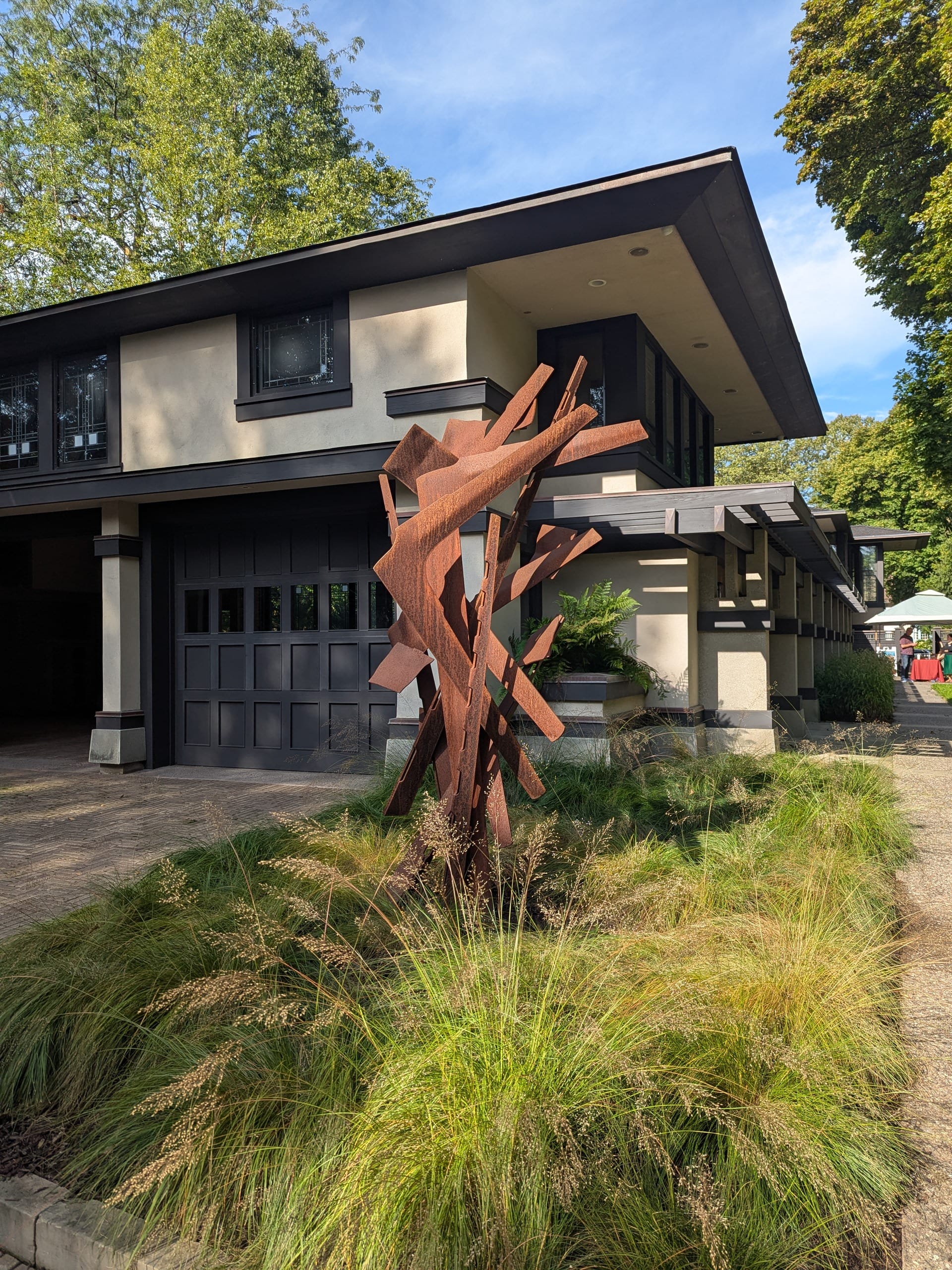 A dozen blocks from us crouches the Edward E Boynton House, a mid-career work by Frank Lloyd Wright. This is a grand 5,500 square foot home that Wright designed in 1908. It was originally a country estate on the edge of town with grounds of about two acres (Wikipedia will say one acre but I measured).