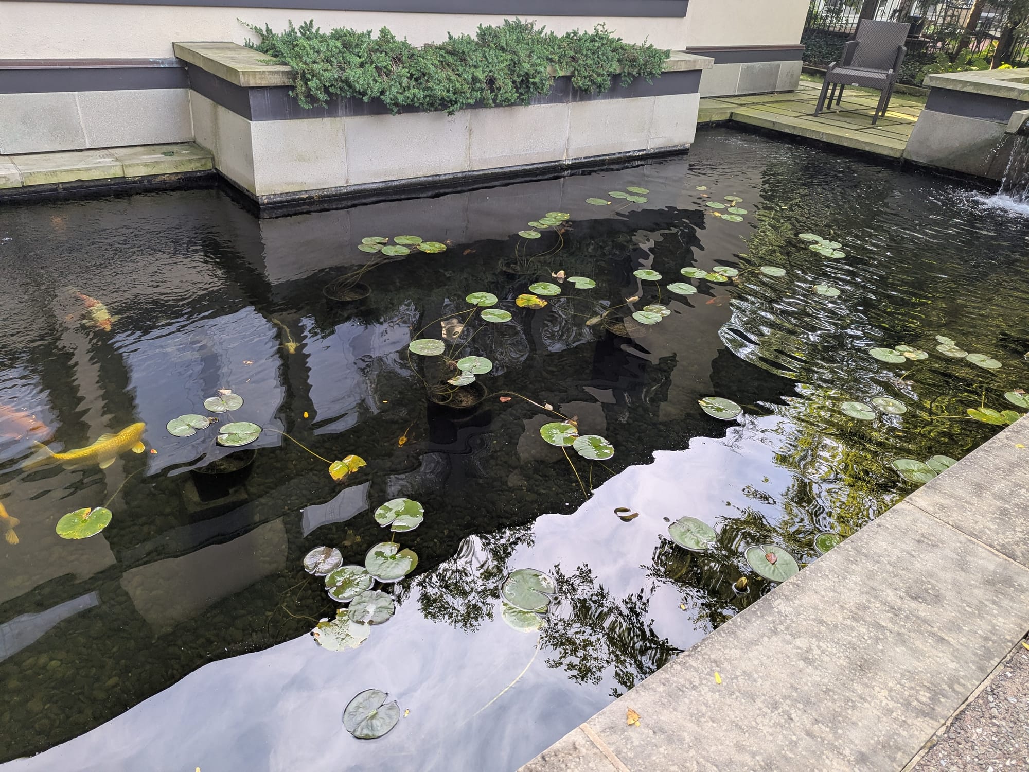 The original estate had a reflecting pool and the reconstruction has a beautiful pond full of massive koi and tiny lily pads.