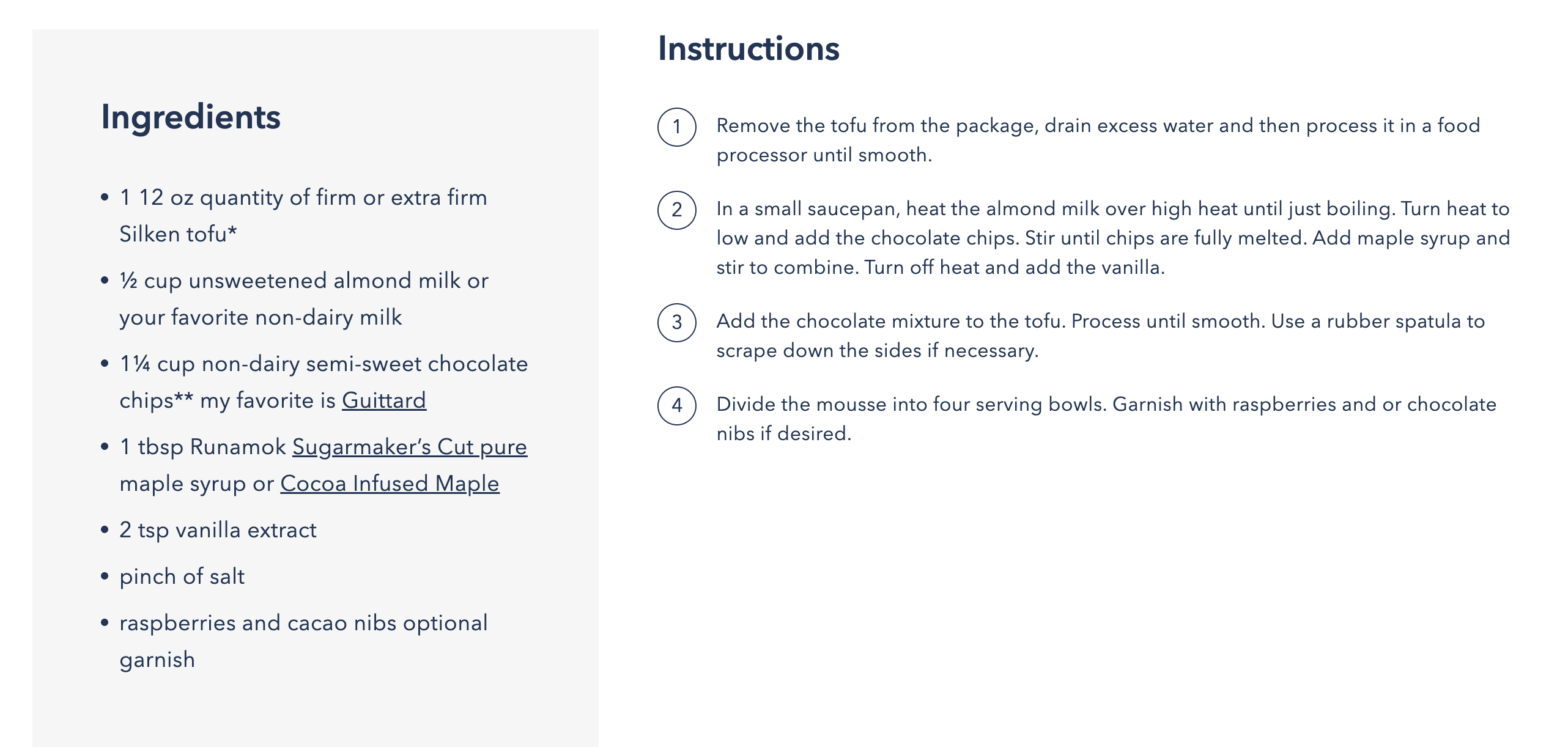 We made this recipe to take to dinner with friends, and everyone tried it and liked it, including our host who is not an adventurous eater. Now, she put the cow milk whipped cream we took along to sweeten the deal on top to balance her fears about the tofu, but seeing her go for a second helping was a huge compliment.