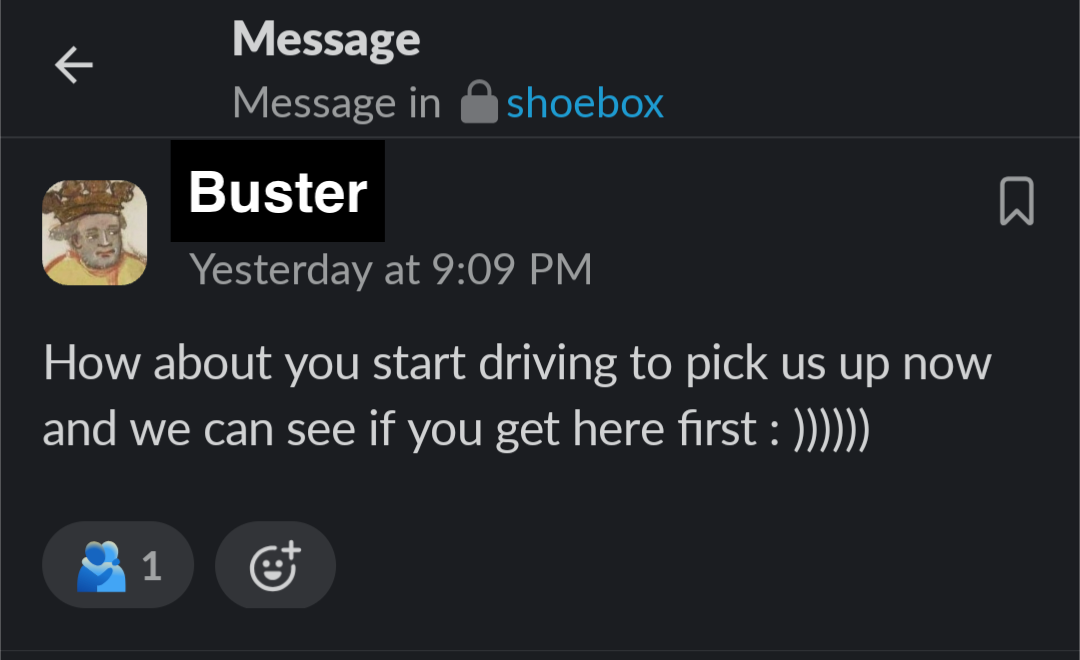 Got this text from Buster at 9:09 p.m.:
