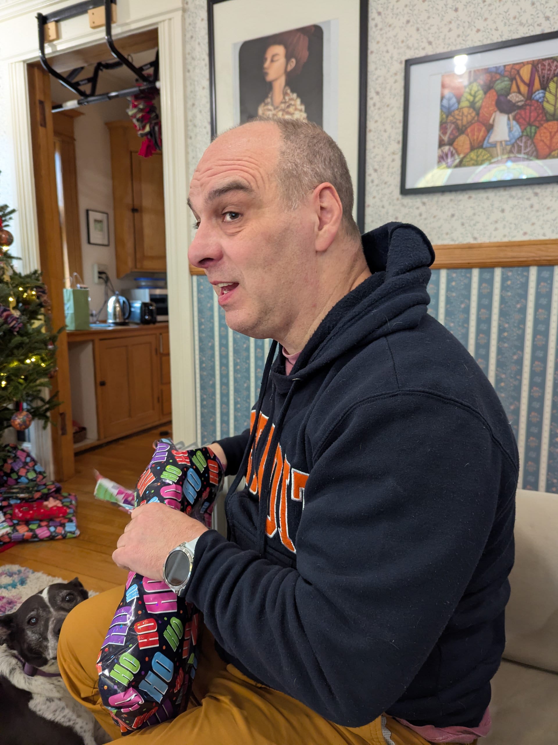We opened our traditional one-present-per-person gift. Since we weren't doing pajamas for everyone this year, Yessa, Buds, and I opened our sweaters, but Monkey and Buster branched out on what they wanted to open.