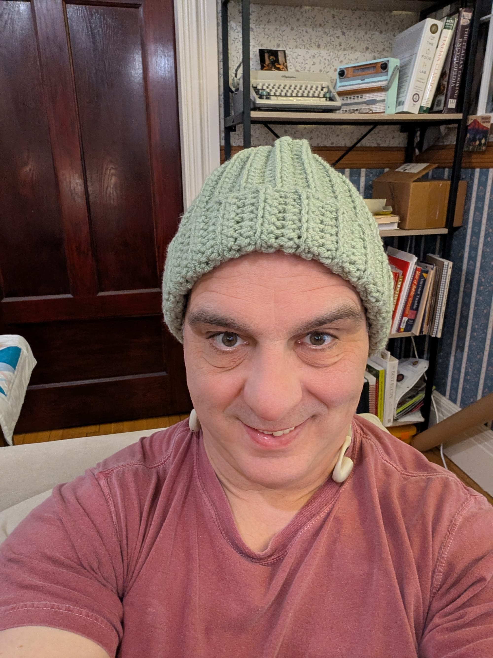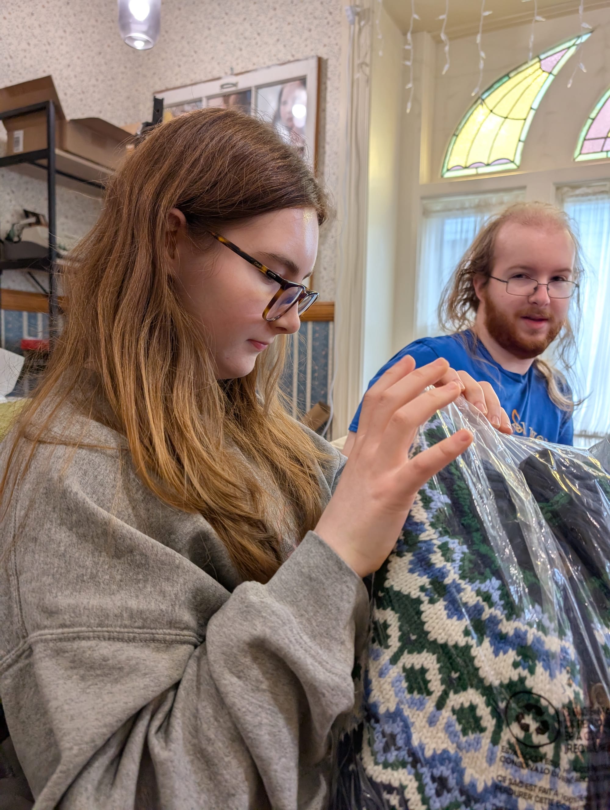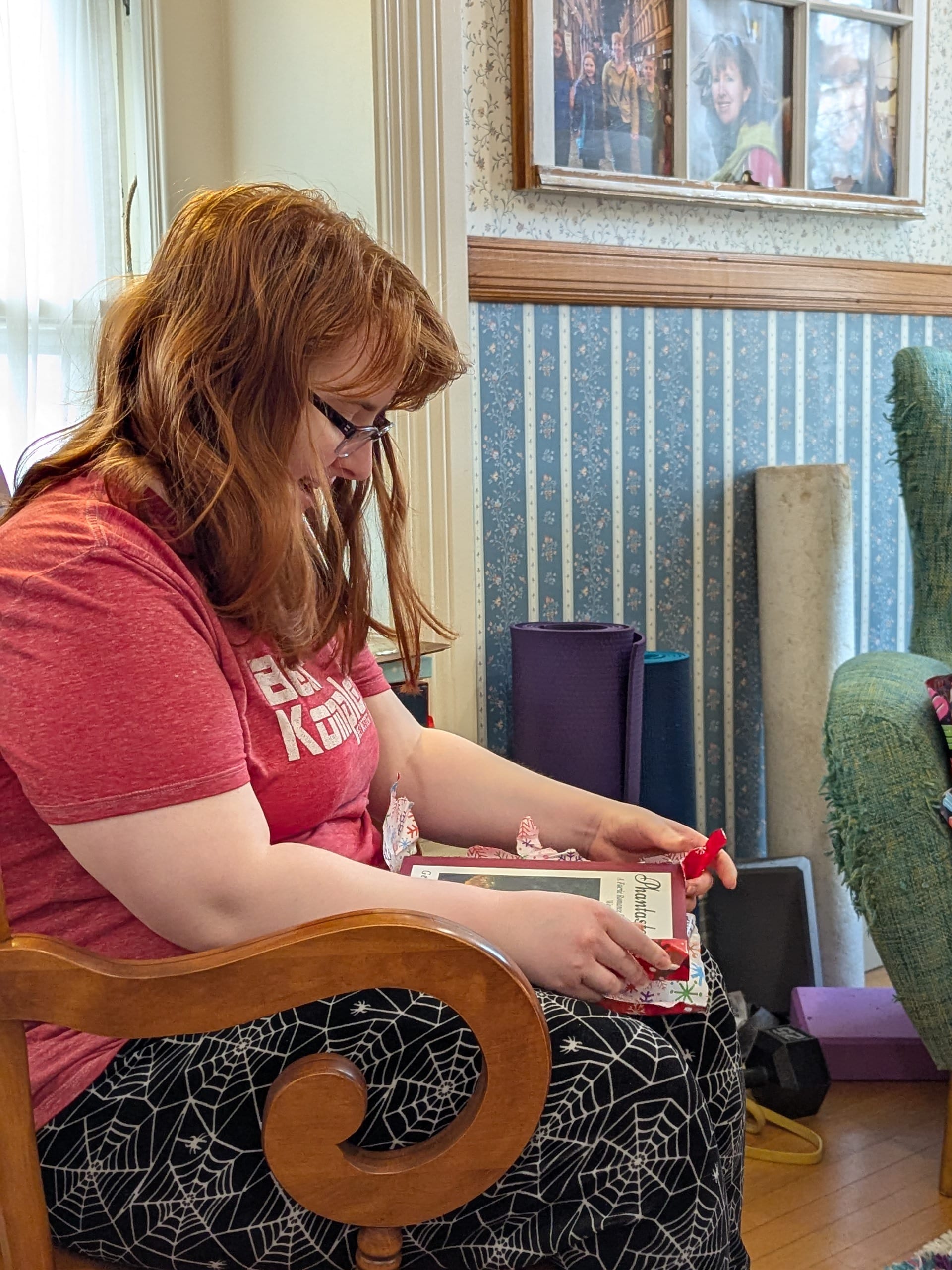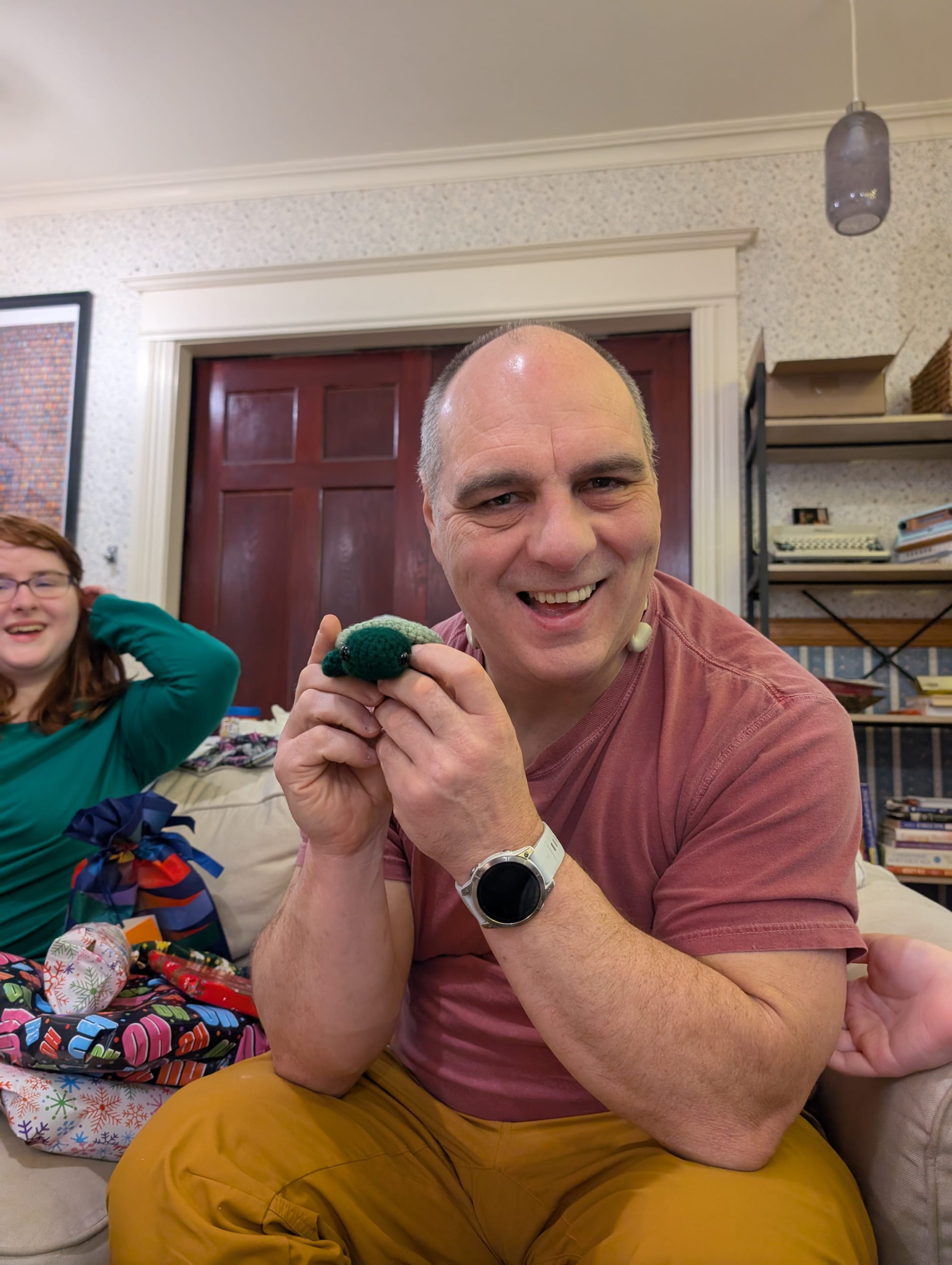 Once everyone was up and the cinnamon rolls were in the oven, we began opening presents. Monkey is the big gift giver, and she helped Buds and me out with choosing presents for her siblings, and then when we decided to do Secret Santas again within the family, she got to buy even more presents, plus she always loves to buy gifts for everyone, even if they aren't her Secret Santa recipient. Yessa also crocheted gifts for people, including the world's cutest turtle for Buds, and headbands for Monkey and me.