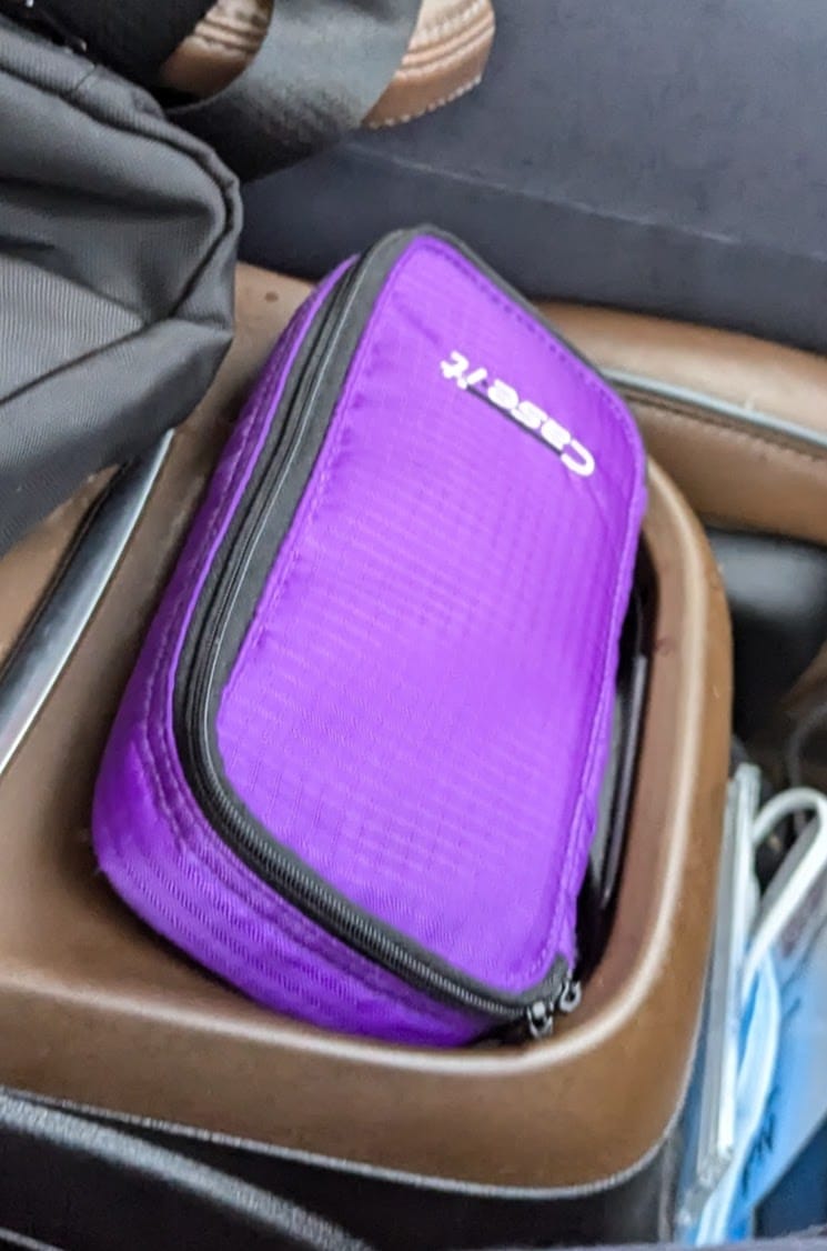 This morning, Buds took the purple pouch out to get the van warmed up before CrossFit. The purple pouch holds the car fob, the house key, all my cards and cash. It goes everywhere with me.