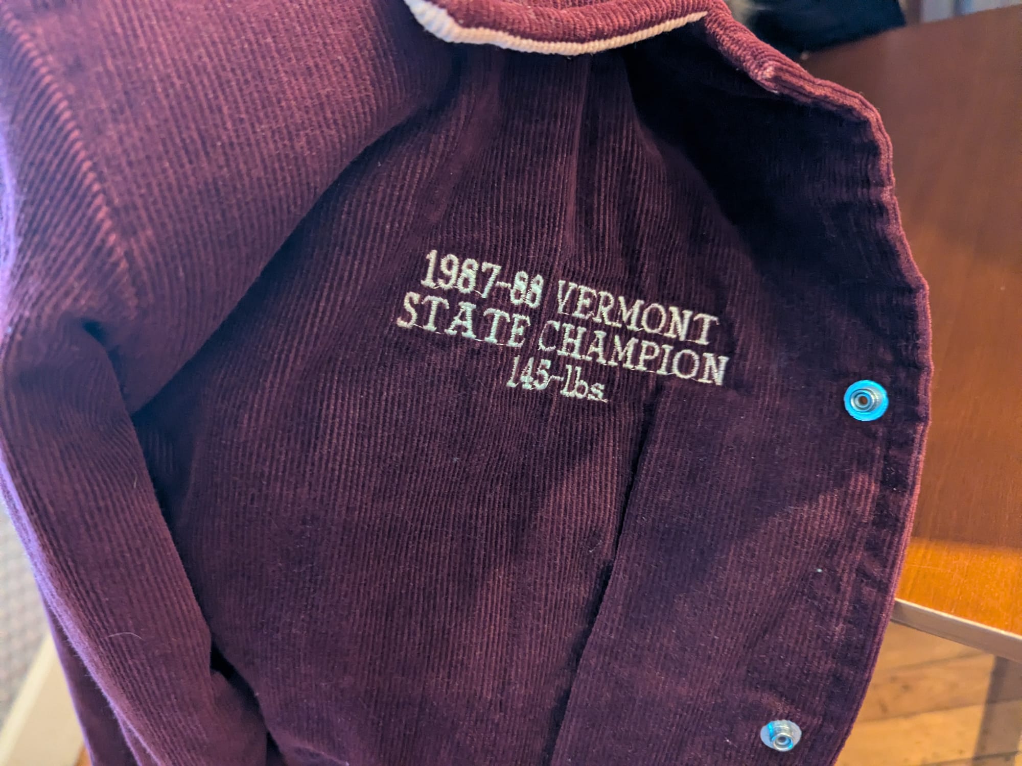 Buddie's mom found his corduroy State Championship wrestling jacket and brought it along to give back to him when we all gathered at Mount Snow in December. The jacket now fits me, so I've been wearing it when the weather is a little warmer.
